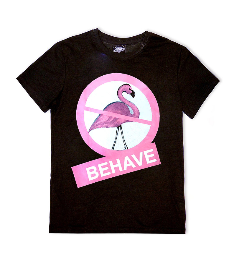 A unique unisex black T shirt from our Samples collection with our iconic all over ‘Behave’ Print.