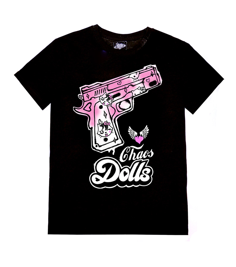 A unique unisex black T shirt from our Samples collection with our iconic all over ‘Chaos Dolls’ Print.