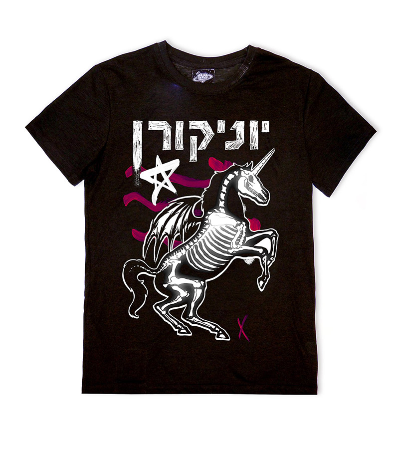 A unique unisex black T shirt from our Samples collection with our iconic all over ‘Dark Unicorn’ Print.