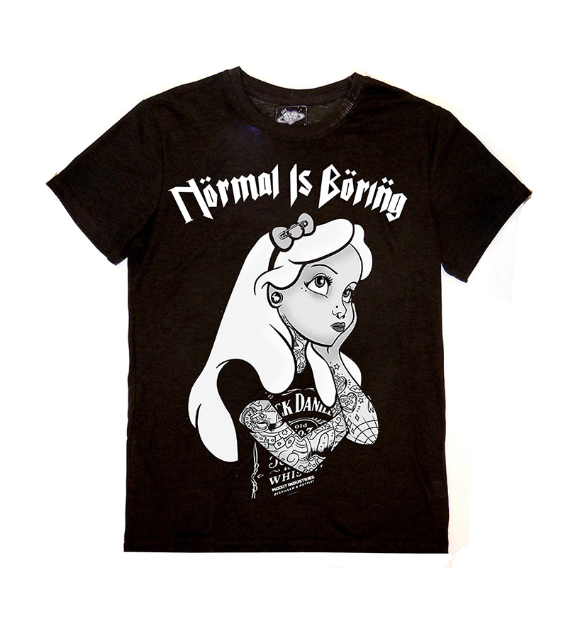 A unique unisex black T shirt from our Samples collection with our iconic all over ‘Don’t Care Alice Princess’ Print.