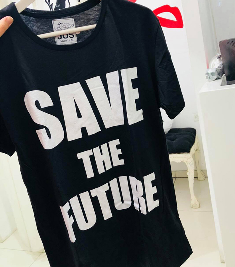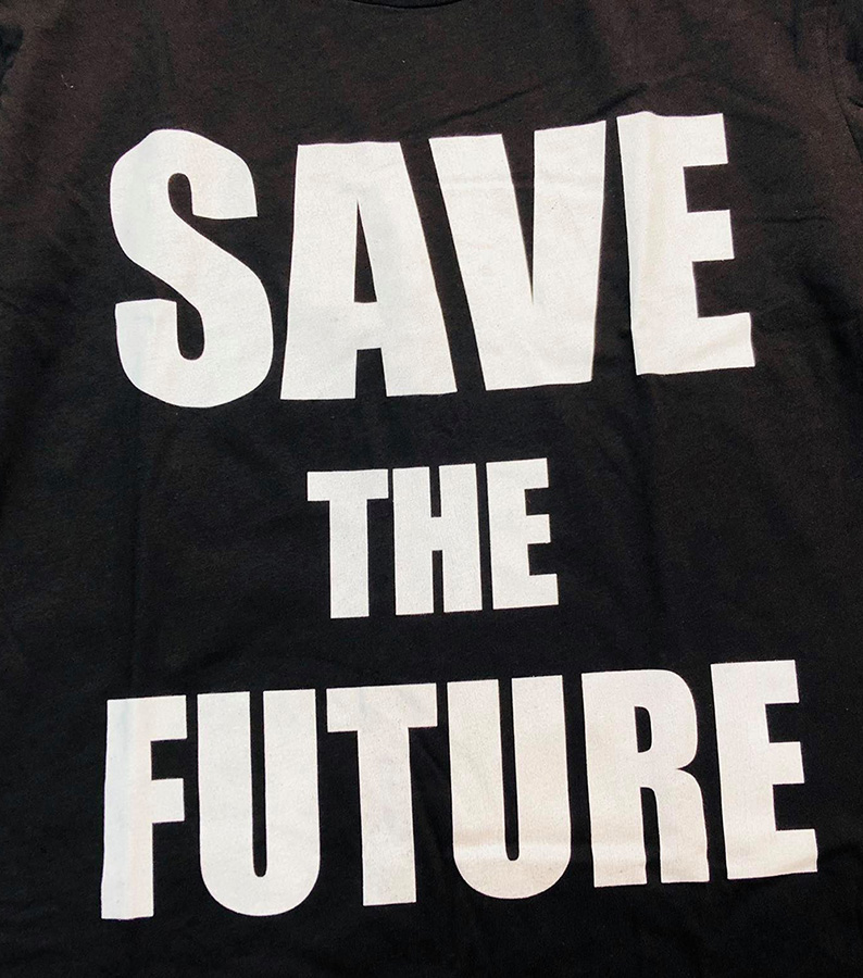 A unique unisex black T shirt from our Samples collection with our iconic all over ‘Save The Futue’ Print.
