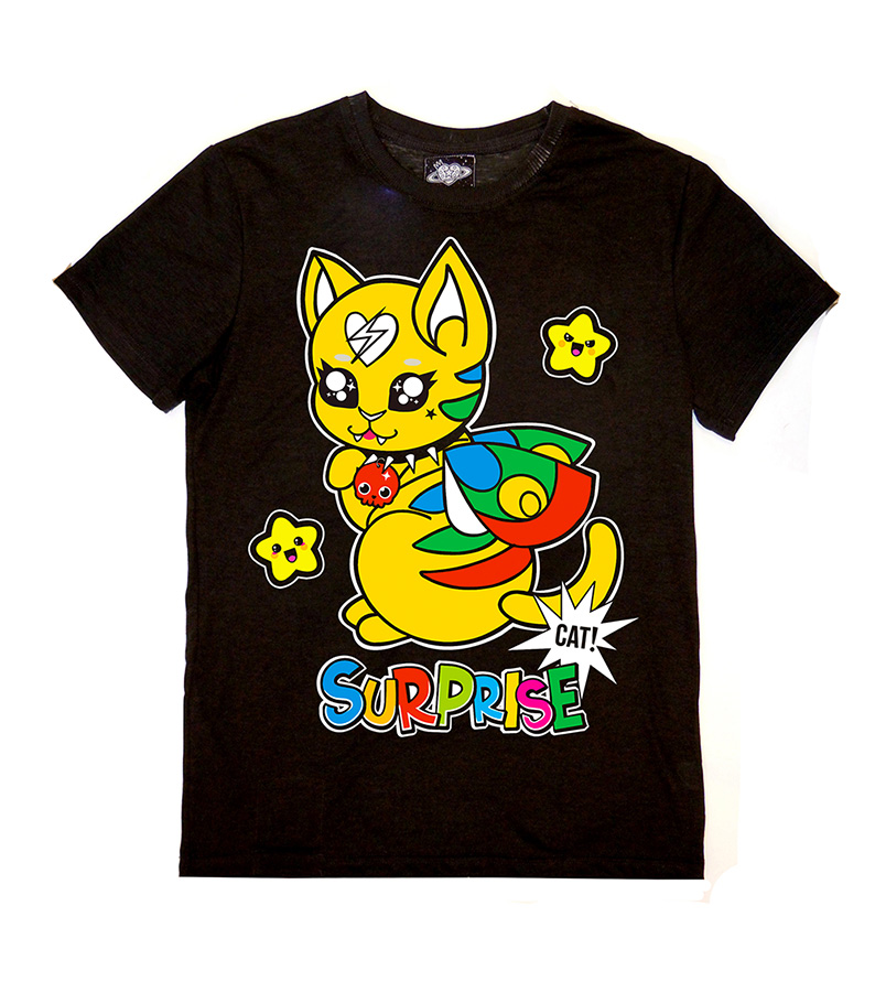 A unique unisex black T shirt from our Samples collection with our iconic all over ‘Surprise Cat’ Print.